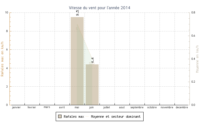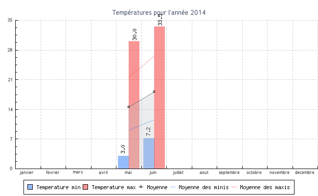 | juin | 7.2 °C | 11.1 °C | 33.5 °C | 26.8 °C | 18.1 °C | 0.4 km/h | 5.1 km/h | SSO |