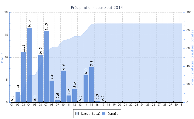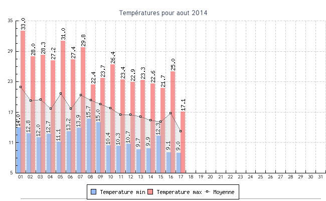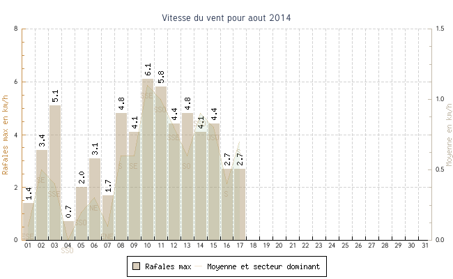 | 01 | 14.0 °C | 33.0 °C | 21.9 °C | 0.1 km/h (1.4 km/h) | ESE |